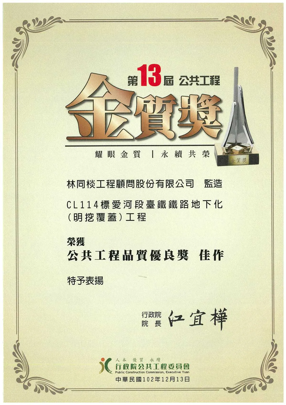 102年度第13屆公共工程金質獎-公共工程品質優良獎(中央土木1類)(監造)