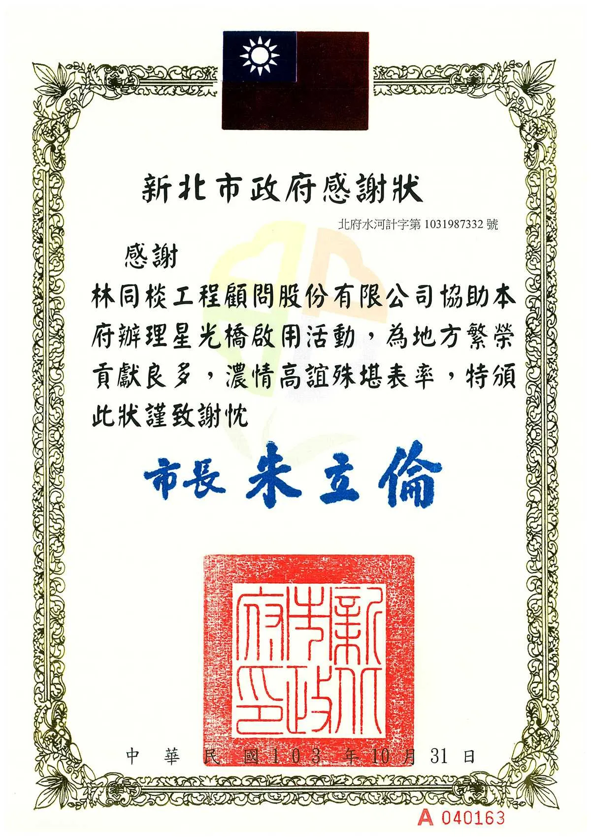 103年度新北市政府啟用感謝狀