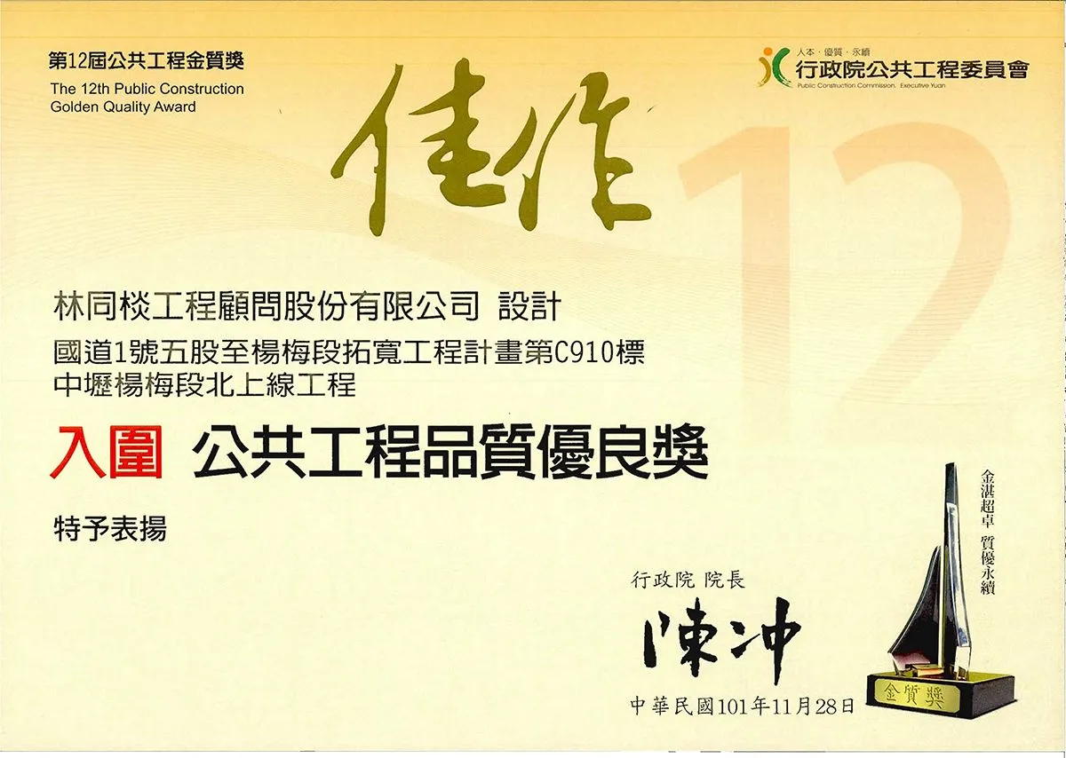 101年度第12屆公共工程金質獎-公共工程品質優良獎(中央土木1類)(入圍)(設計)