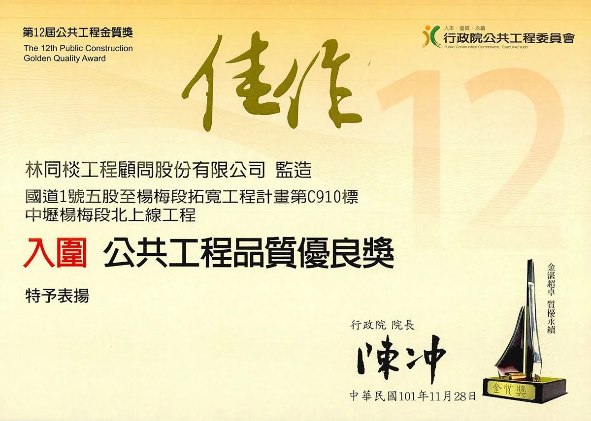101年度第12屆公共工程金質獎-公共工程品質優良獎(中央土木1類)(入圍)(設計、監造)