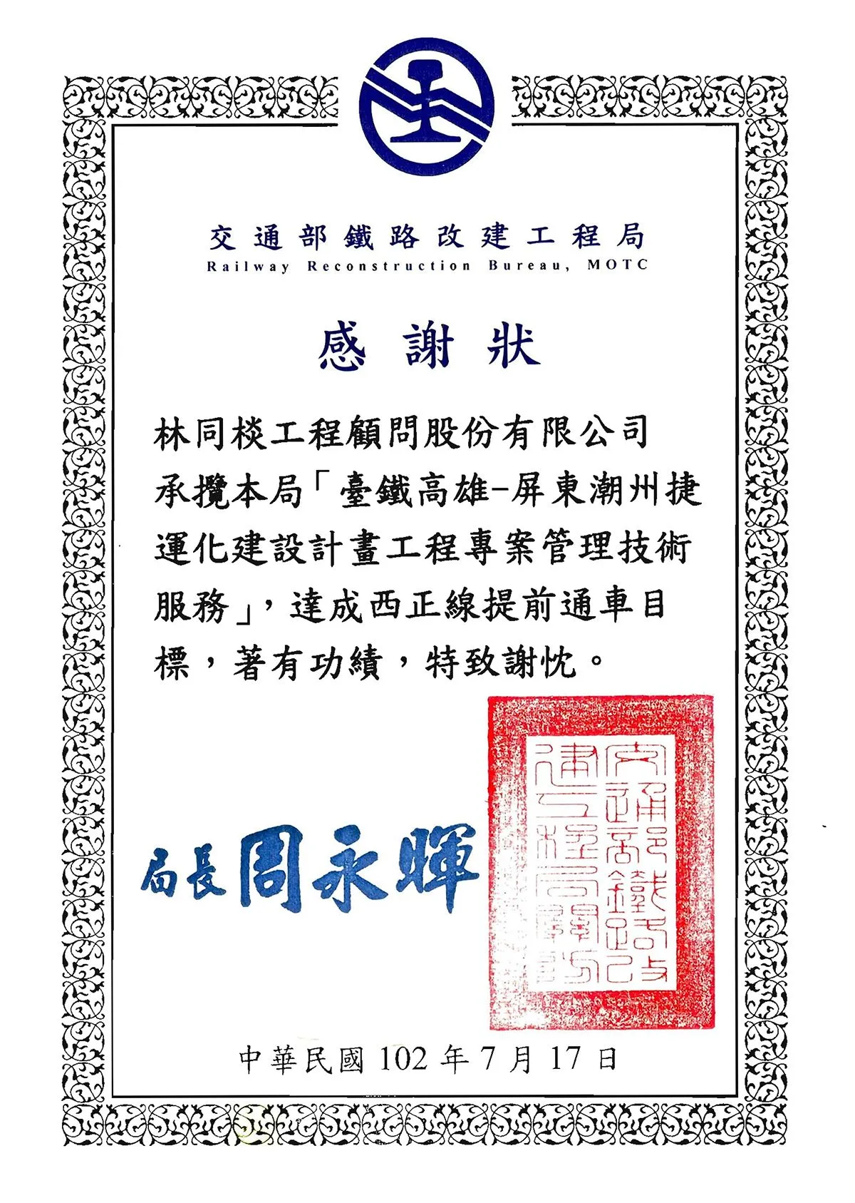 102年度屏東潮州捷運化西正線提前通車感謝狀