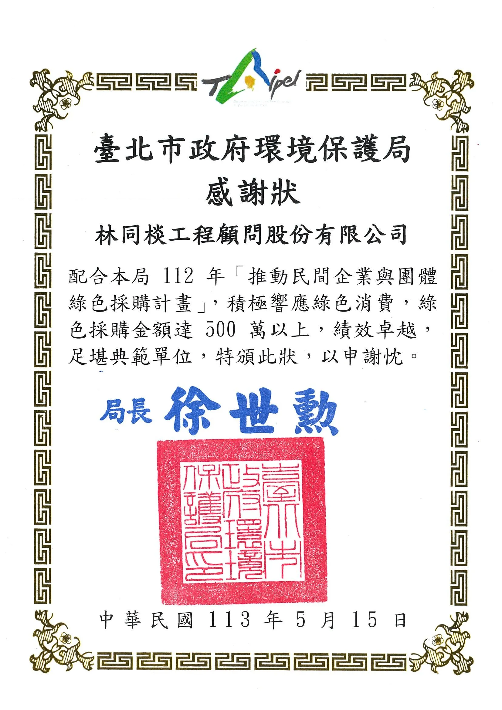 112年度臺北市政府環境保護局感謝狀[推動民間企業與團體綠色採購計畫]