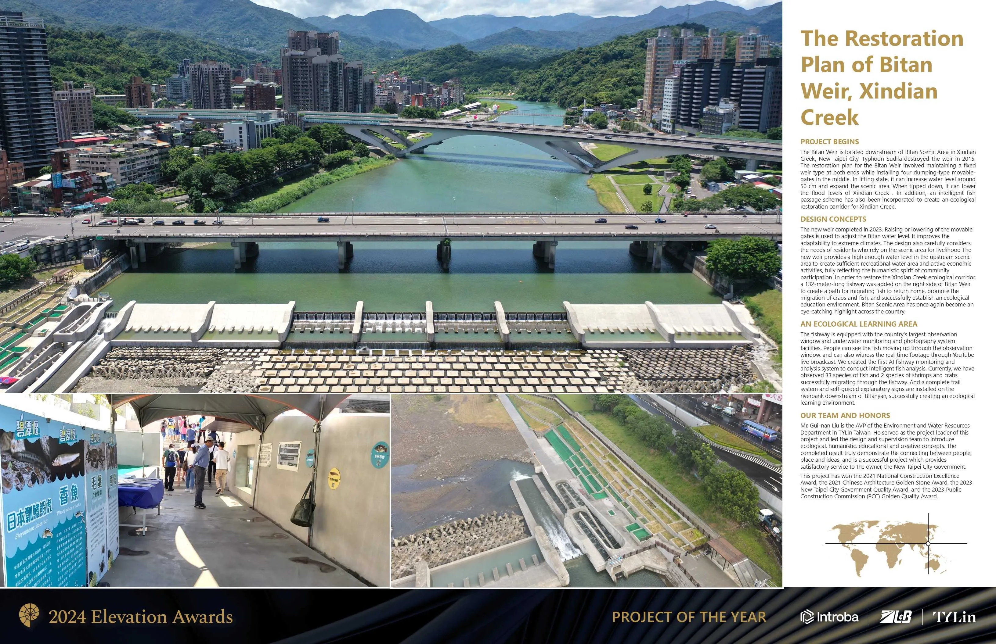 位於新北市新店碧潭風景區下游的碧潭堰於 2015 年因颱風蘇迪勒受損。本案採用兩端固定堰與中央四座傾倒式活動閘門的新設計,兼顧防洪與景觀調節。當閘門抬升時可提高水位 50 公分,擴大遊憩水域;放下時可降低洪峰水位。此外,新增長達 132 公尺的智慧型魚道,設有全國最大觀察窗與 AI 魚類辨識系統,結合生態教育步道,打造兼具防災、生態與人文的學習場域。該案榮獲多項國內建築與公共工程品質獎項。