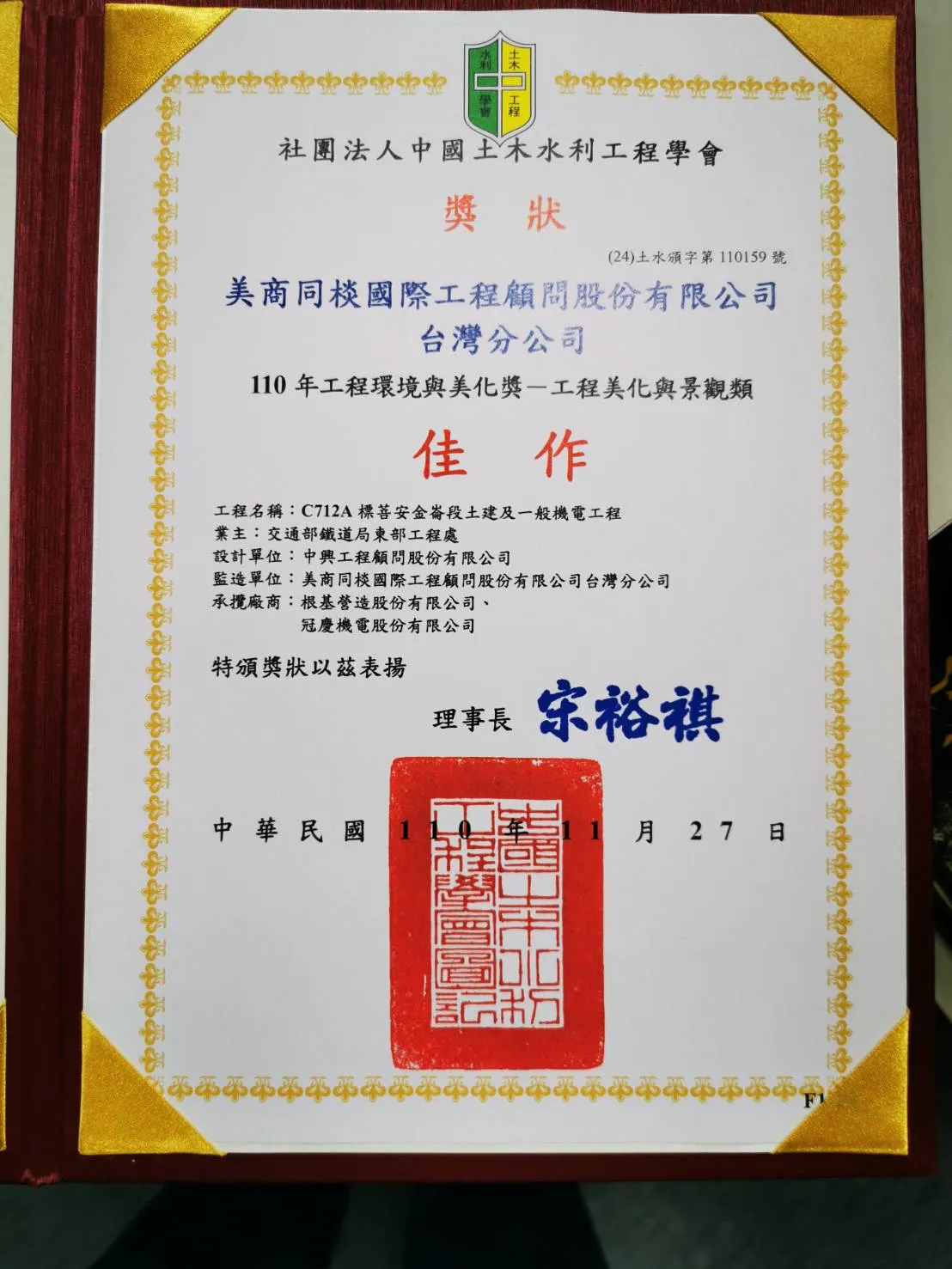 「南迴計畫南迴線C712A標菩安金崙段土建及一般機電工程監造服務」榮獲中國土木水利工程學會110年工程環境美化獎