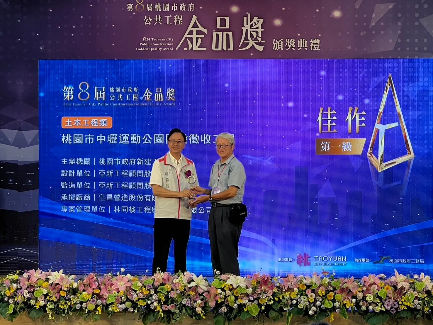 113年桃園市政府第八屆公共工程金品獎於9月3日頒獎,本公司專案獲兩項大獎肯定。「桃園市中壢運動公園區段徵收工程」專案管理獲「土木工程類第一級佳作」、「桃園市大漢溪上游埔頂排水水環境改善計畫」專案管理獲「設施工程類第三級優等」。