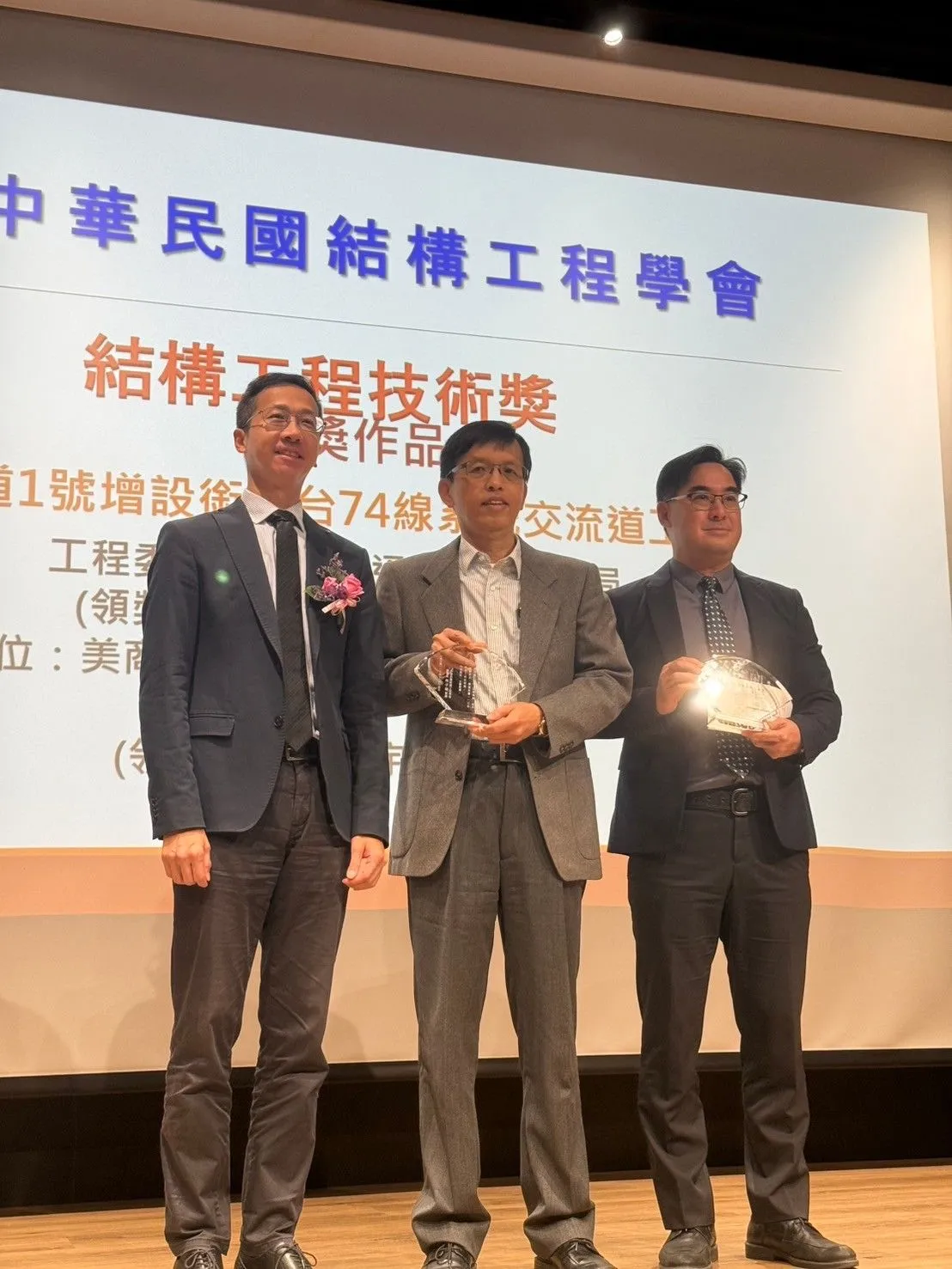 兩大獎項於12月16日於國震中心頒獎,高公局林生發副總偕本公司王宇睿董事長、彭康瑜副總及吳明興副總工共同領獎。期許同仁與時俱進了解國際最新工程技術發展,擁抱改變,跨出舒適圈。再次恭喜得獎專案及同仁。