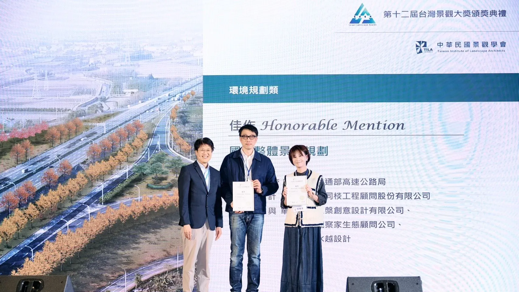 第十二屆景觀大獎於3月22日於台北花博公園流行館舉行,本公司以「國道景觀整體規劃」及「翱翔過去.綠意未來-桃園航空城都市生態方舟公園景觀再造(航空城A2標公7公園)」兩項專案獲得「環境規劃類」佳作肯定。